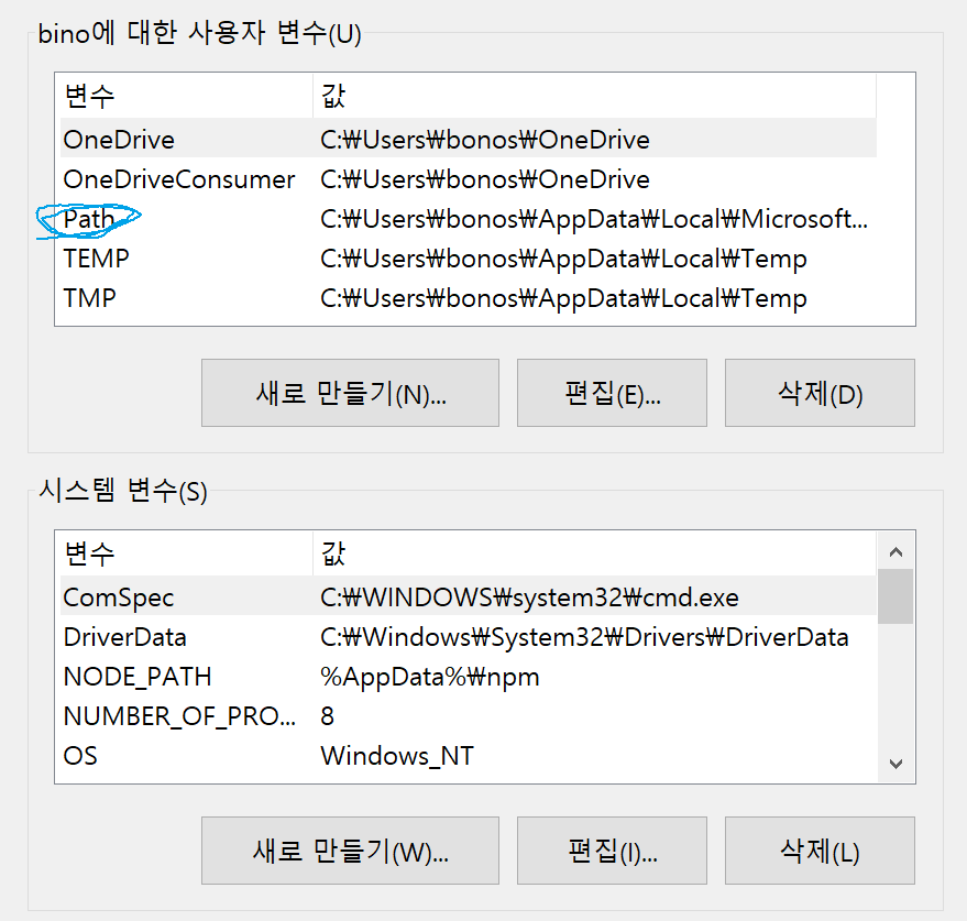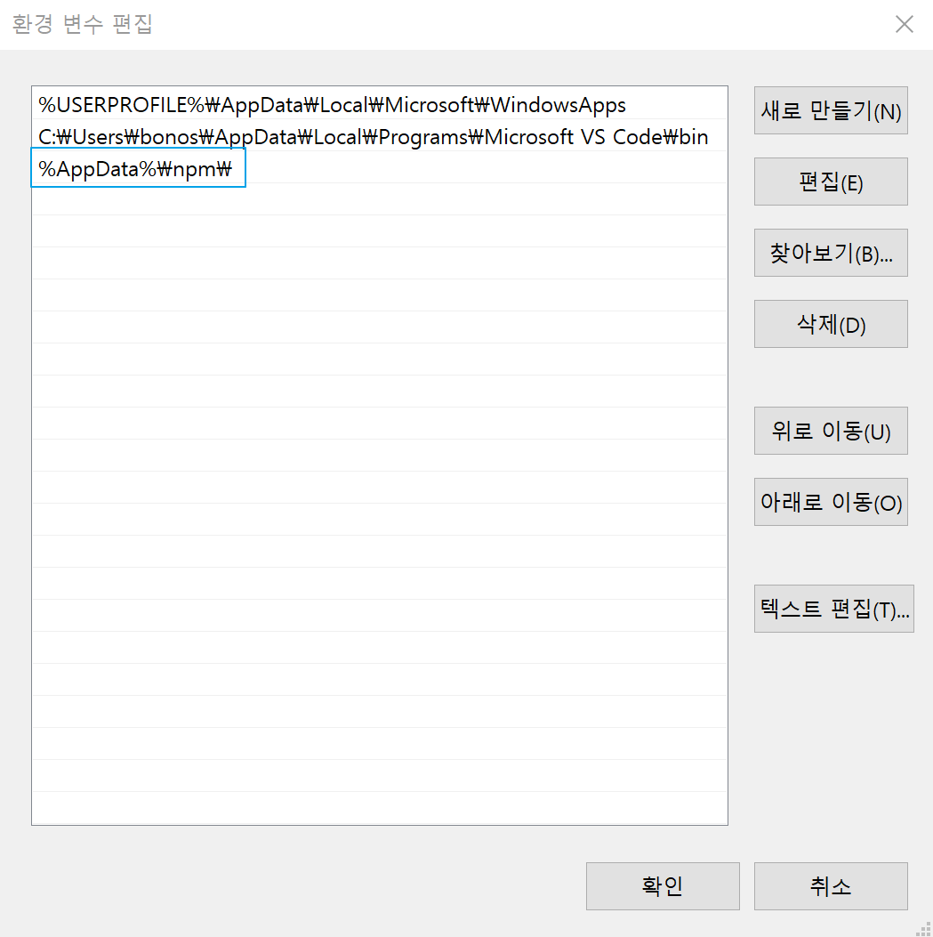 윈도우에서 npm의 패키지를 명령어로서 사용하려면 다른 프로그램과 같이 환경변수에 적용시켜주어야 한다.